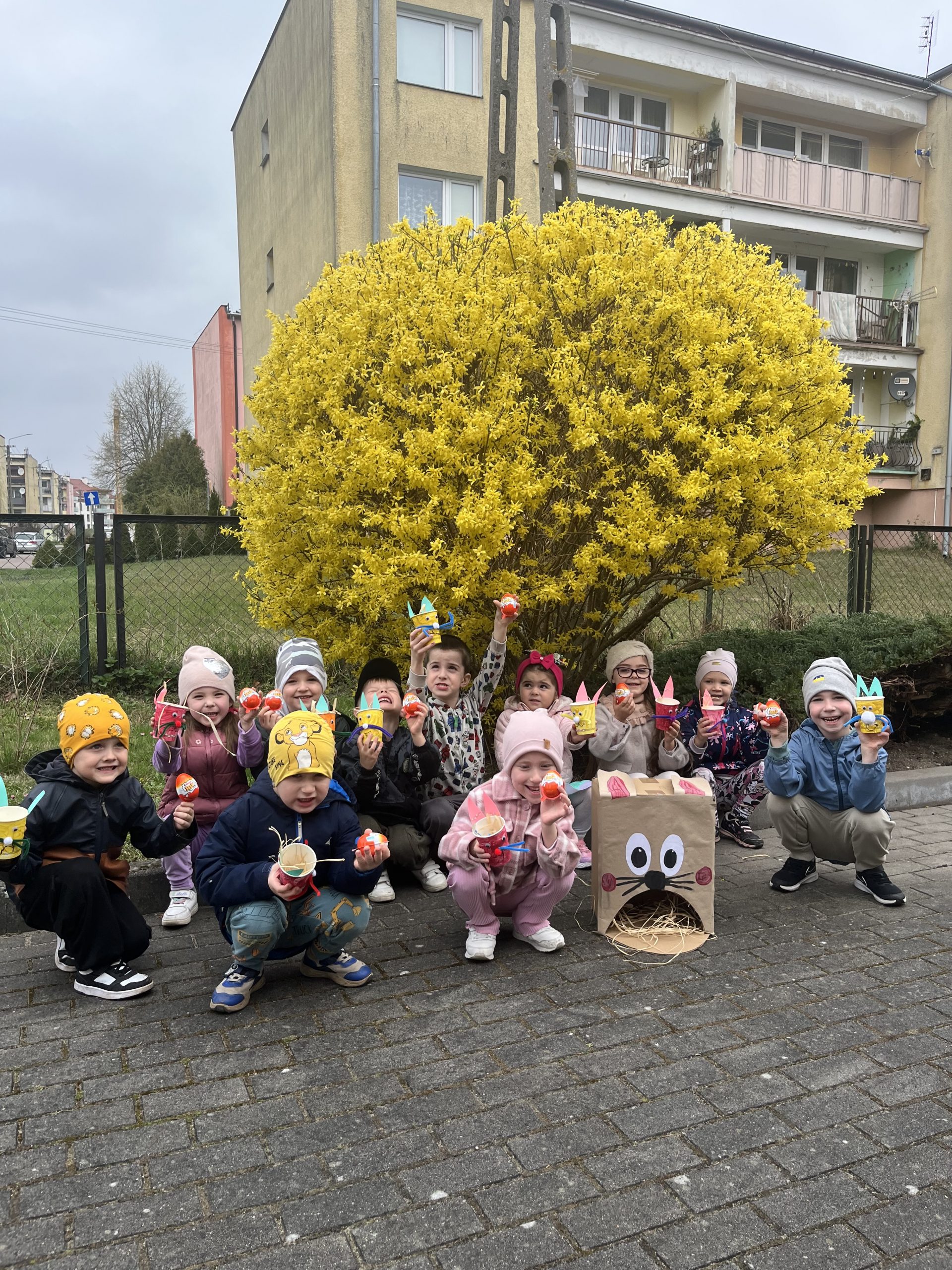 Zgodnie ze wskazówkami naszego Zająca dzieci z grupy Żabek udały się do ogrodu przedszkola szukając wskazówek z zadaniami, które doprowadziły do kolejnej słodkiej niespodzianki.