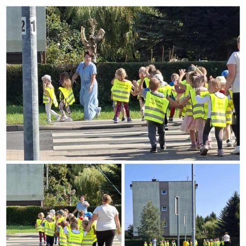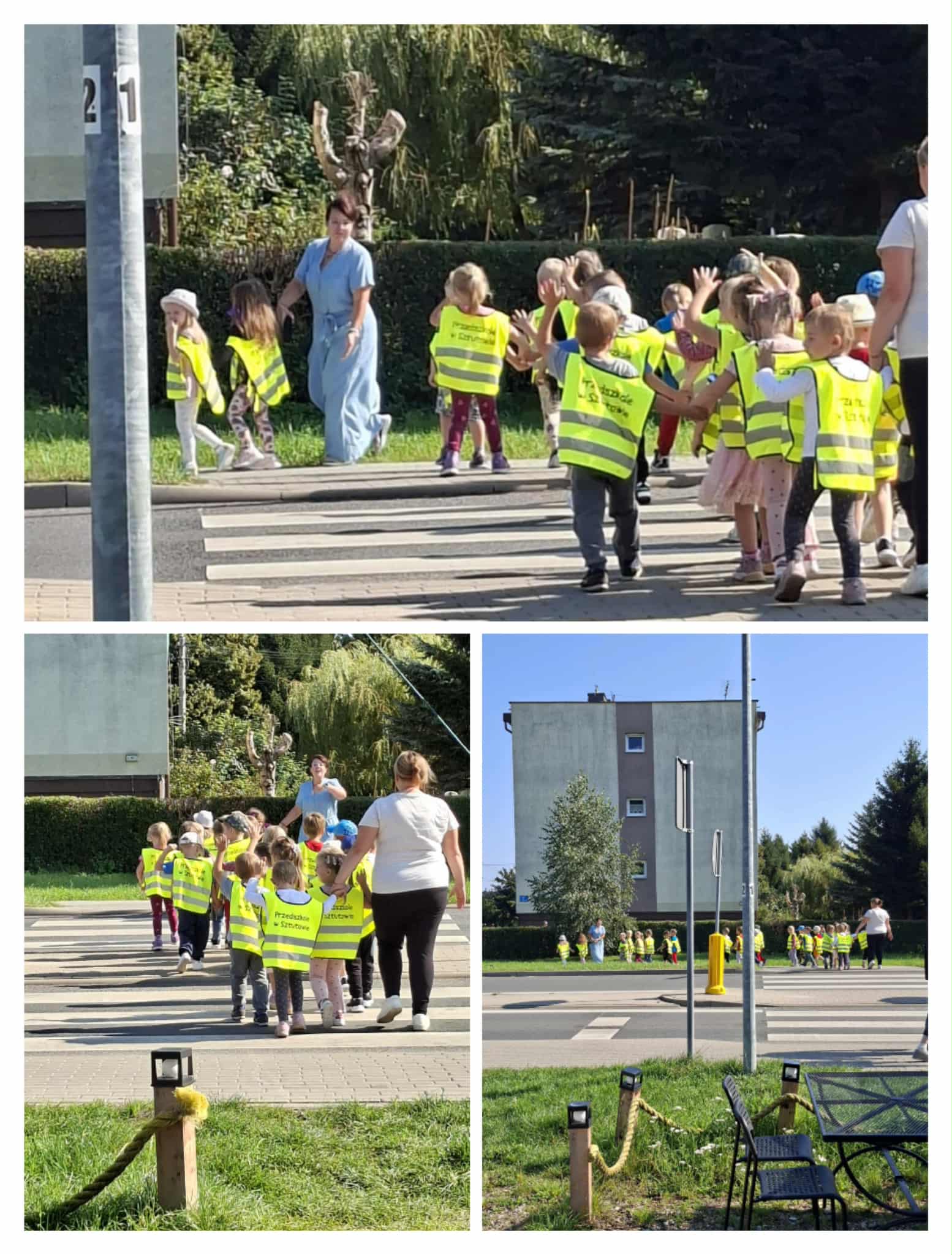 Dzieci przypomniały sobie zasady bezpiecznego poruszania się po przejściu dla pieszych. Podczas spaceru na pobliskie pasy drogowe dzieci ćwiczyły prawidłowe poruszanie się po ulicy.