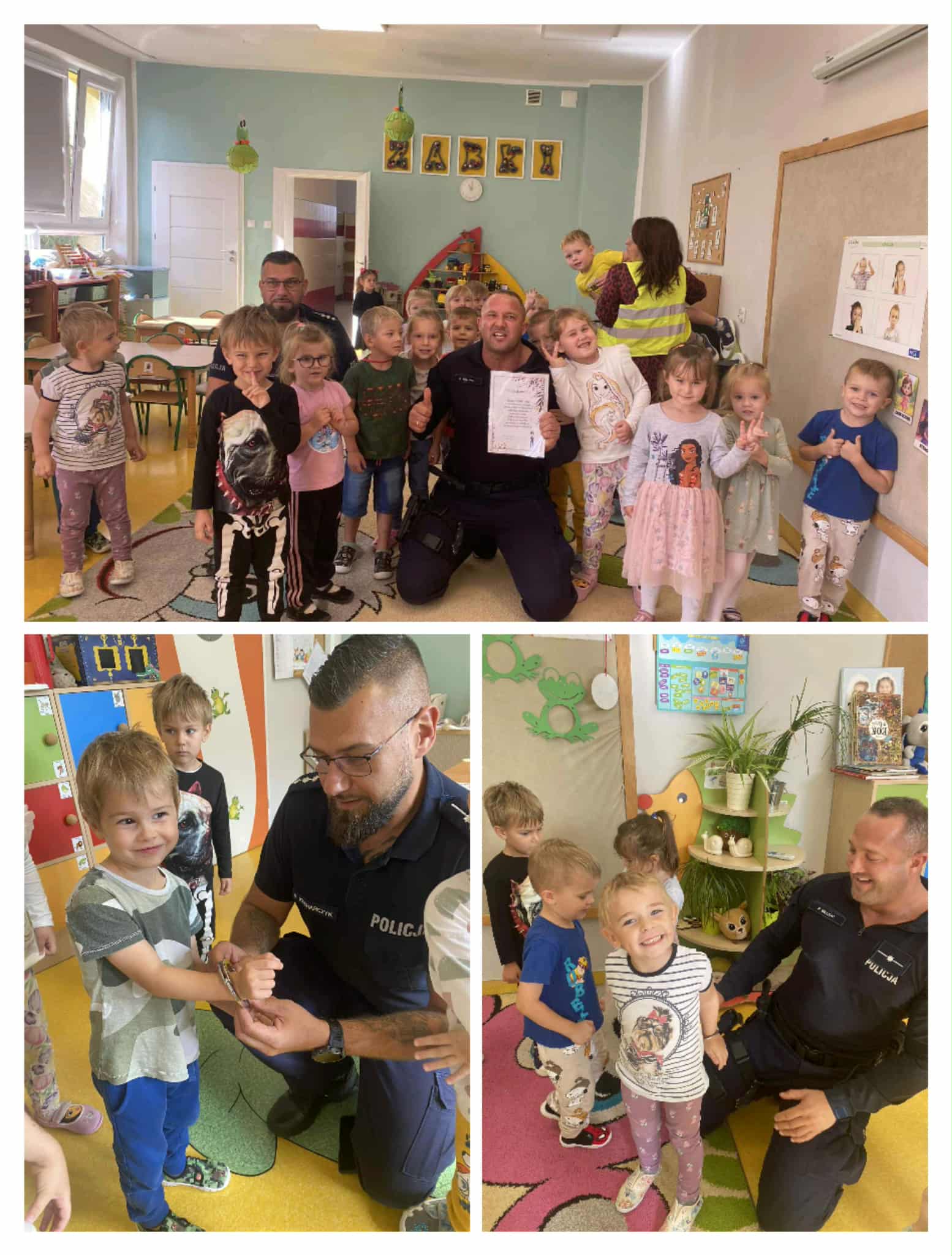 Panowie policjanci spotkali się z dziećmi , by opowiedzieć jak ważne jest bezpieczne poruszanie się po jezdni.