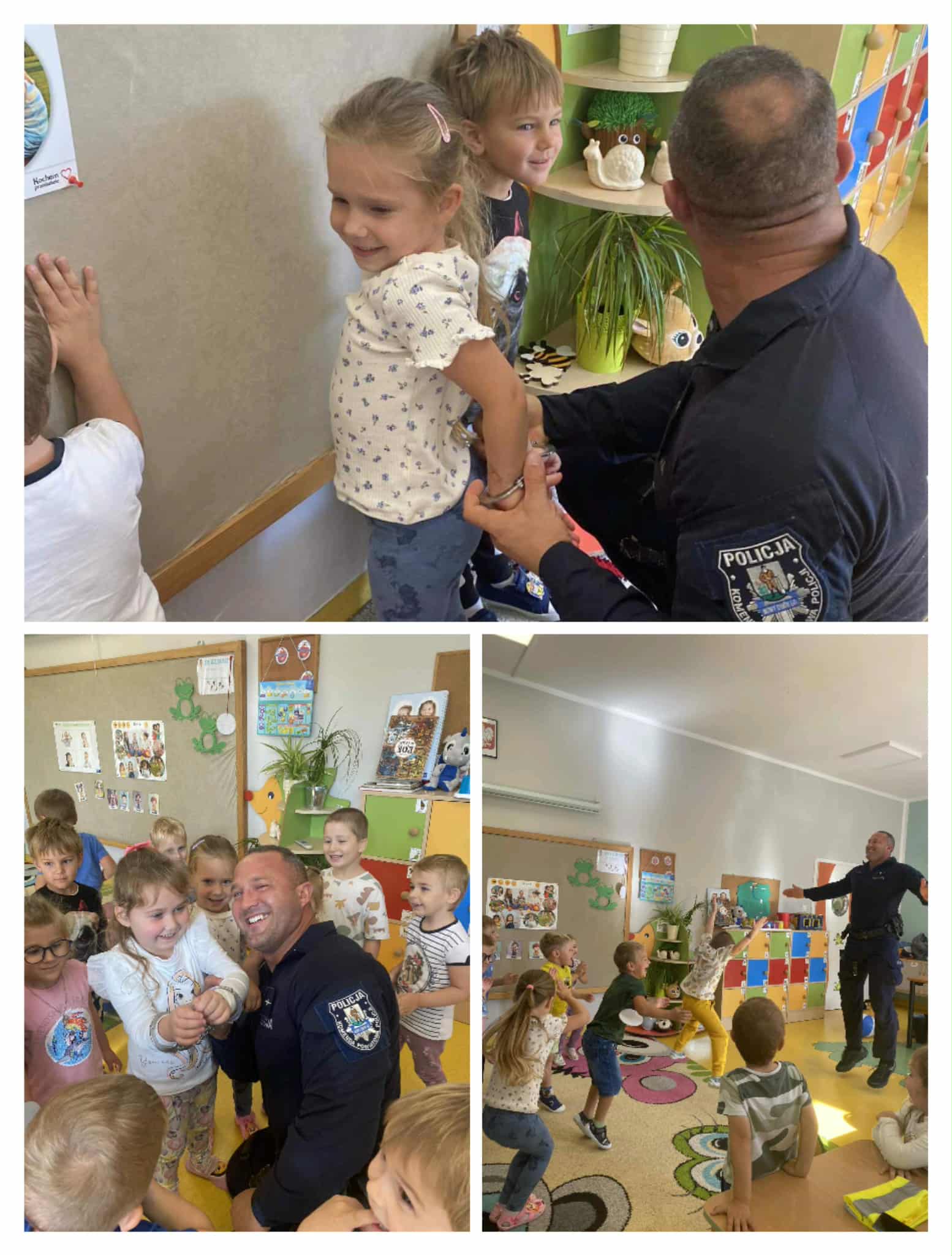 Nasi goście pokazali przedszkolakom, w co musi być wyposażony funkcjonariusz policji oraz zademonstrowali dzieciom procedurę zatrzymania .