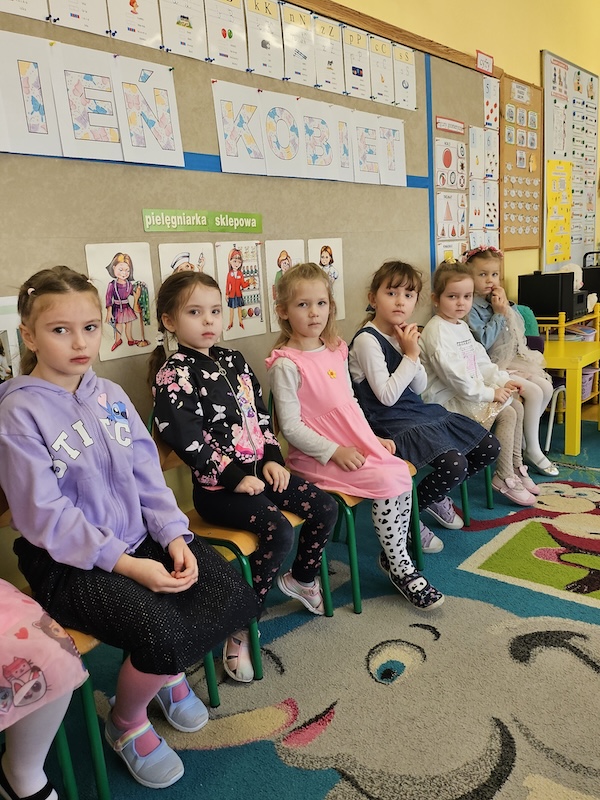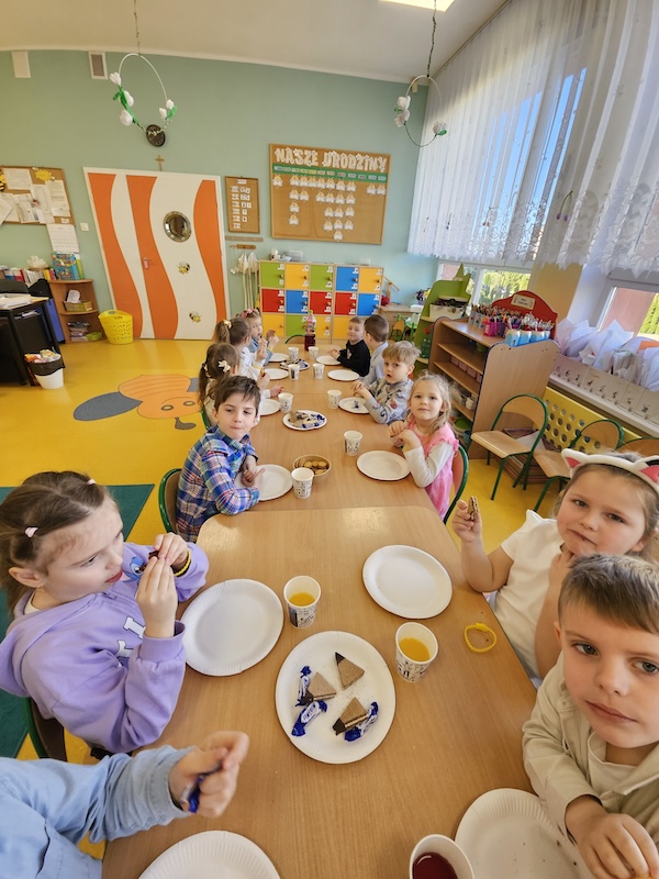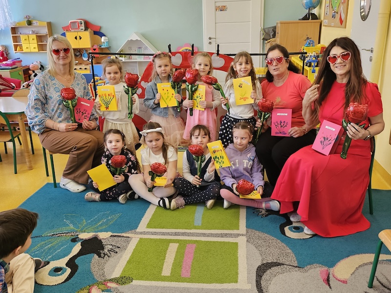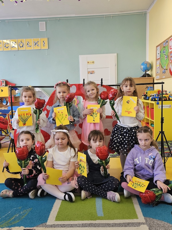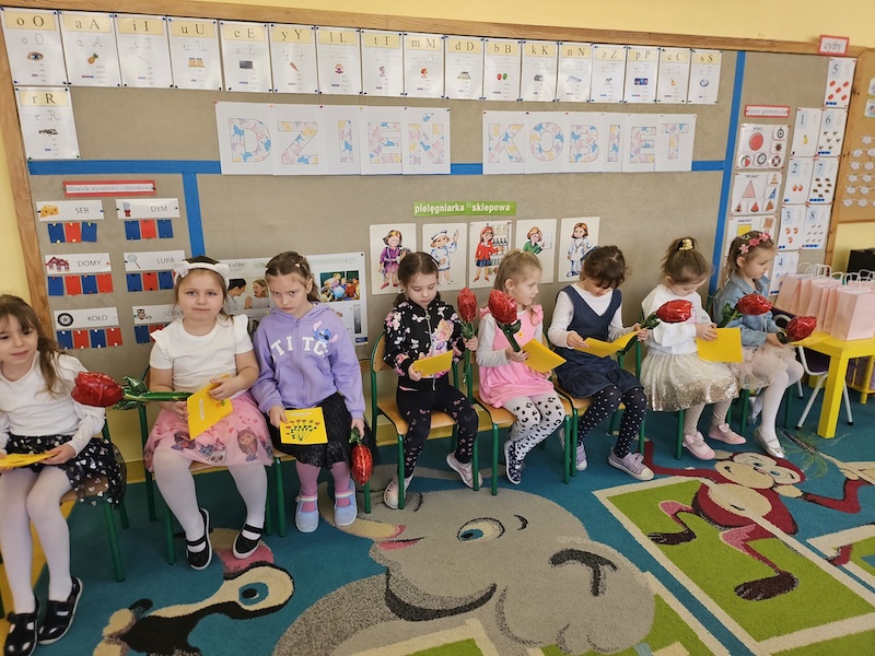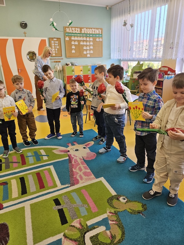 Dzisiaj świętowaliśmy Dzień Kobiet. Chłopcy wręczyli dziewczynkom kwiaty oraz samodzielnie zrobione laurki. Zaśpiewali ,,Sto Lat” i złożyli życzenia. Po poczęstunku odbyła się sesja zdjęciowa, To był bardzo miły dzień!