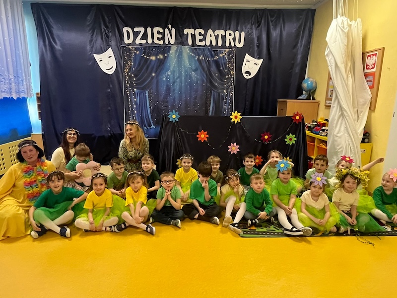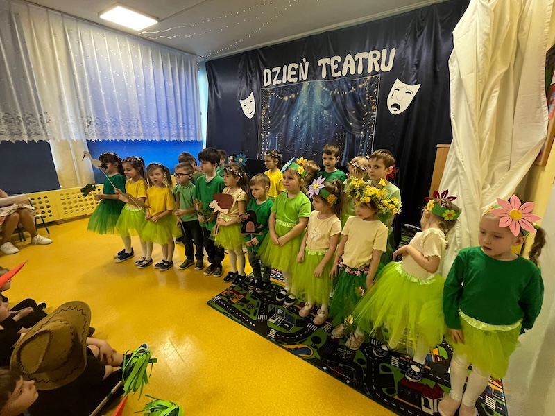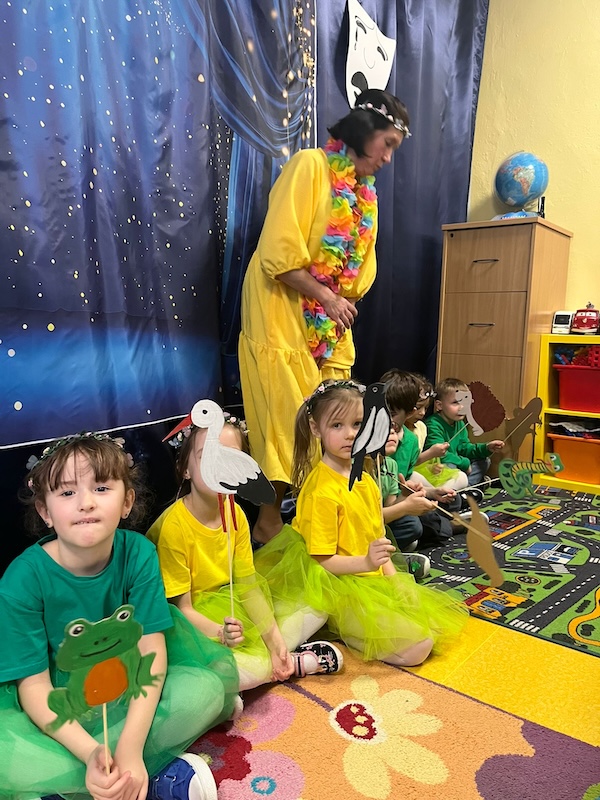Każda grupa przygotowała krótkie przedstawienie. Mogliśmy poznać różne formy teatralne począwszy od teatru aktorskiego w wykonaniu ,,Biedronek” po teatr cieni W wykonaniu ,,Żabek” oraz teatr kukiełkowy w wykonaniu naszej grupy.