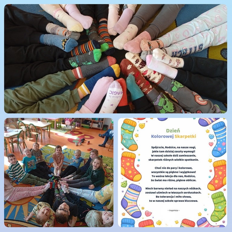 Po raz kolejny dzieci z naszej grupy włączyły się w obchody „Dnia Kolorowej Skarpetki”. Podczas krótkiej pogadanki udało nam się ustalić, że każdy z nas jest na swój sposób inny, różnimy się pod wieloma względami i ta inność jest naturalną rzeczą. Osoby z Zespołem Downa żyją wśród nas. Tak jak my bawią się, śmieją i spełniają swoje marzenia. Dopełnieniem tego dnia było założenie dwóch niepasujących do siebie skarpetek. W ten sposób chcieliśmy pokazać, że integrujemy się z takimi osobami.